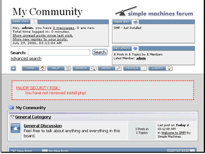 Since we have not deleted the install.php file we will get a warning. This is only displayed to administrator users
